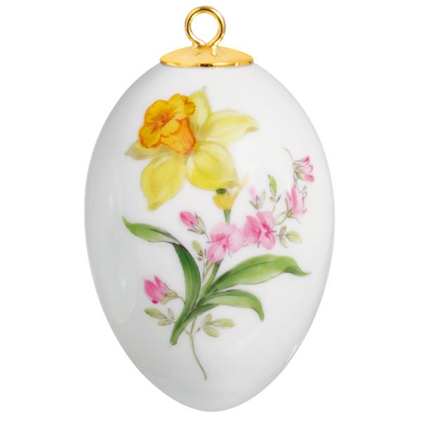 Украшения в виде яиц сейчас везде. Я искала пасхальные яйца, разрисованные нарциссами. В том же Майсене есть и сервизы и вазы с нарциссами.